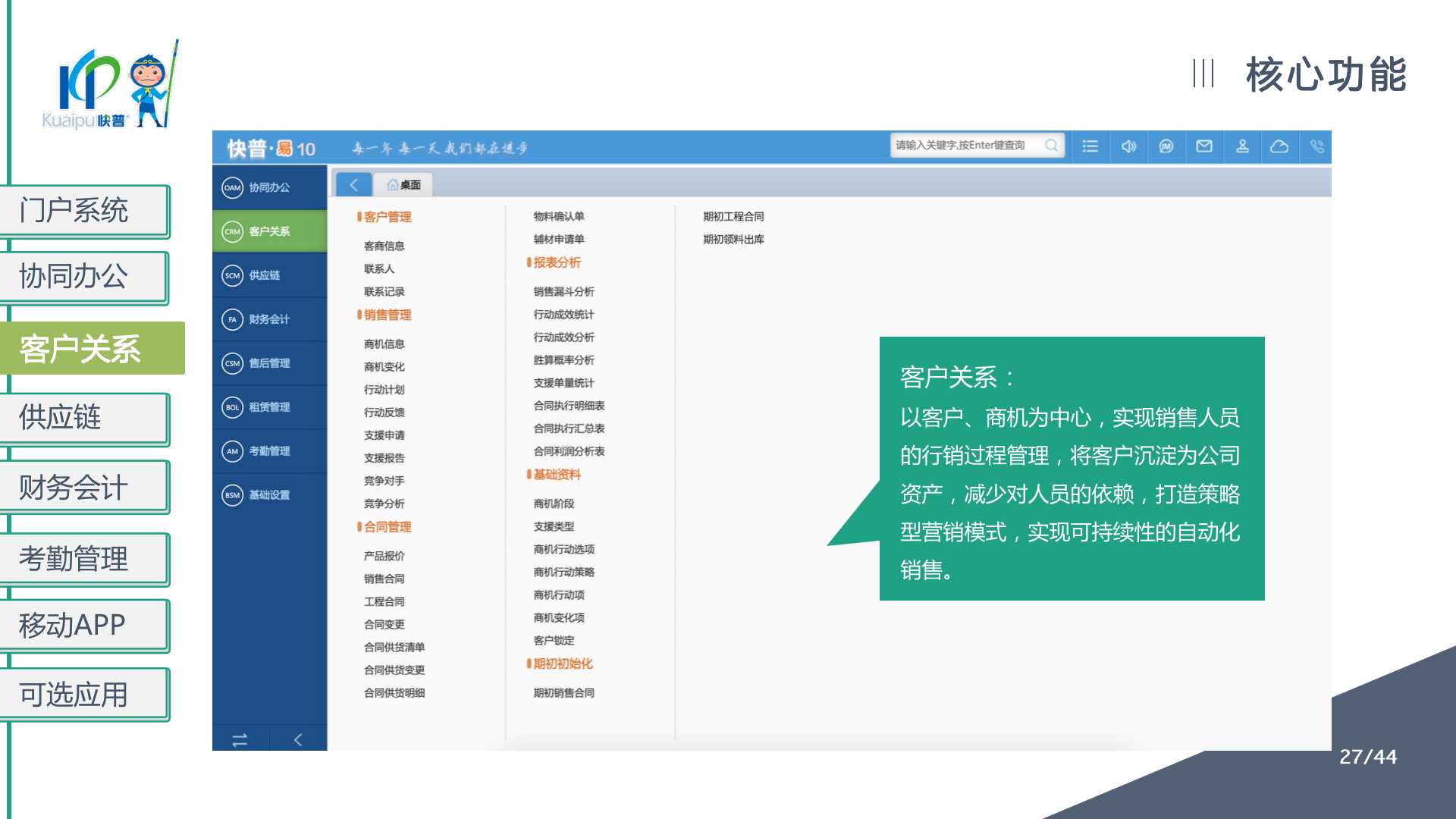 快普易10(商貿(mào)版)提供以客戶(hù)為中心的數(shù)字化管理解決方案,涵蓋客戶(hù)、銷(xiāo)售、庫(kù)存、資金、財(cái)務(wù)等業(yè)財(cái)一體化管理,全面優(yōu)化流程、提高企業(yè)效率,讓每一筆生意明明白白!