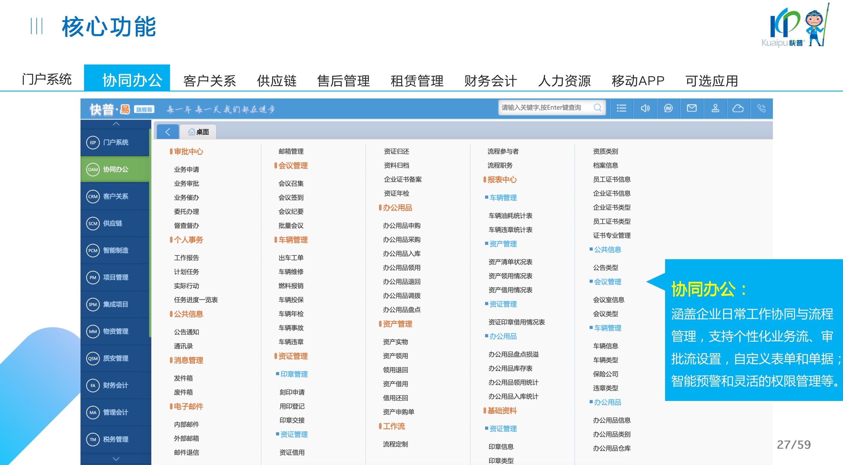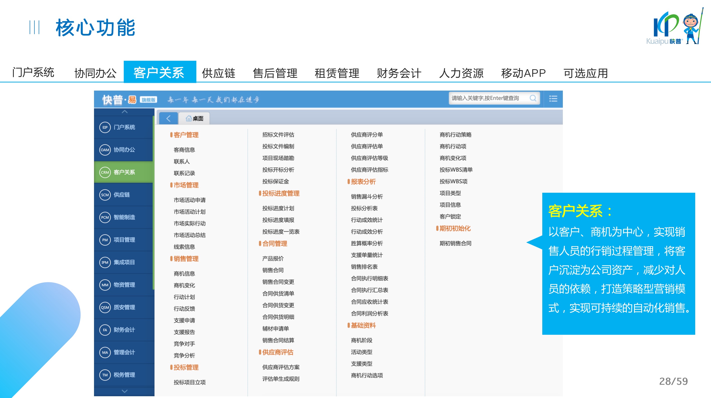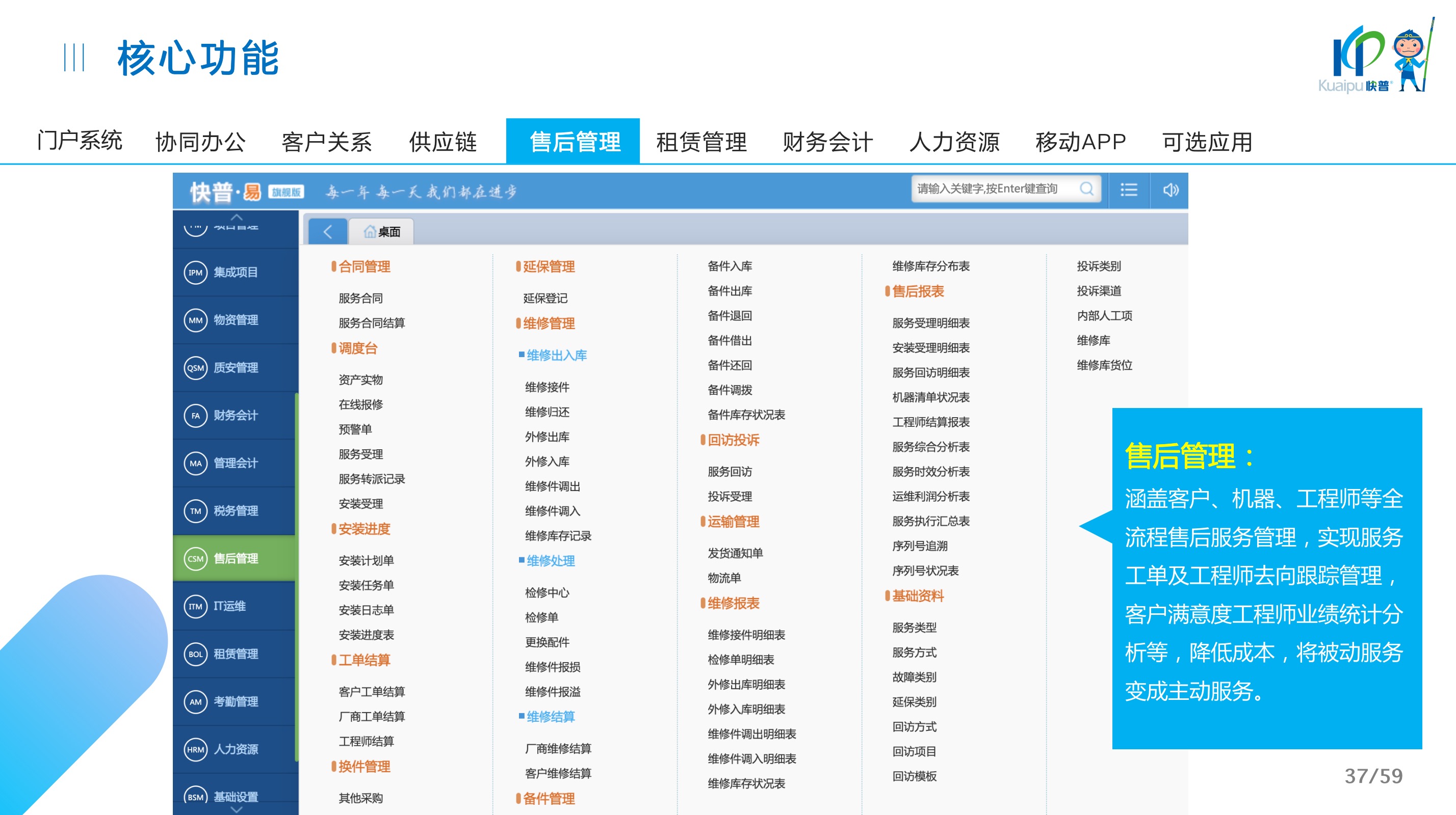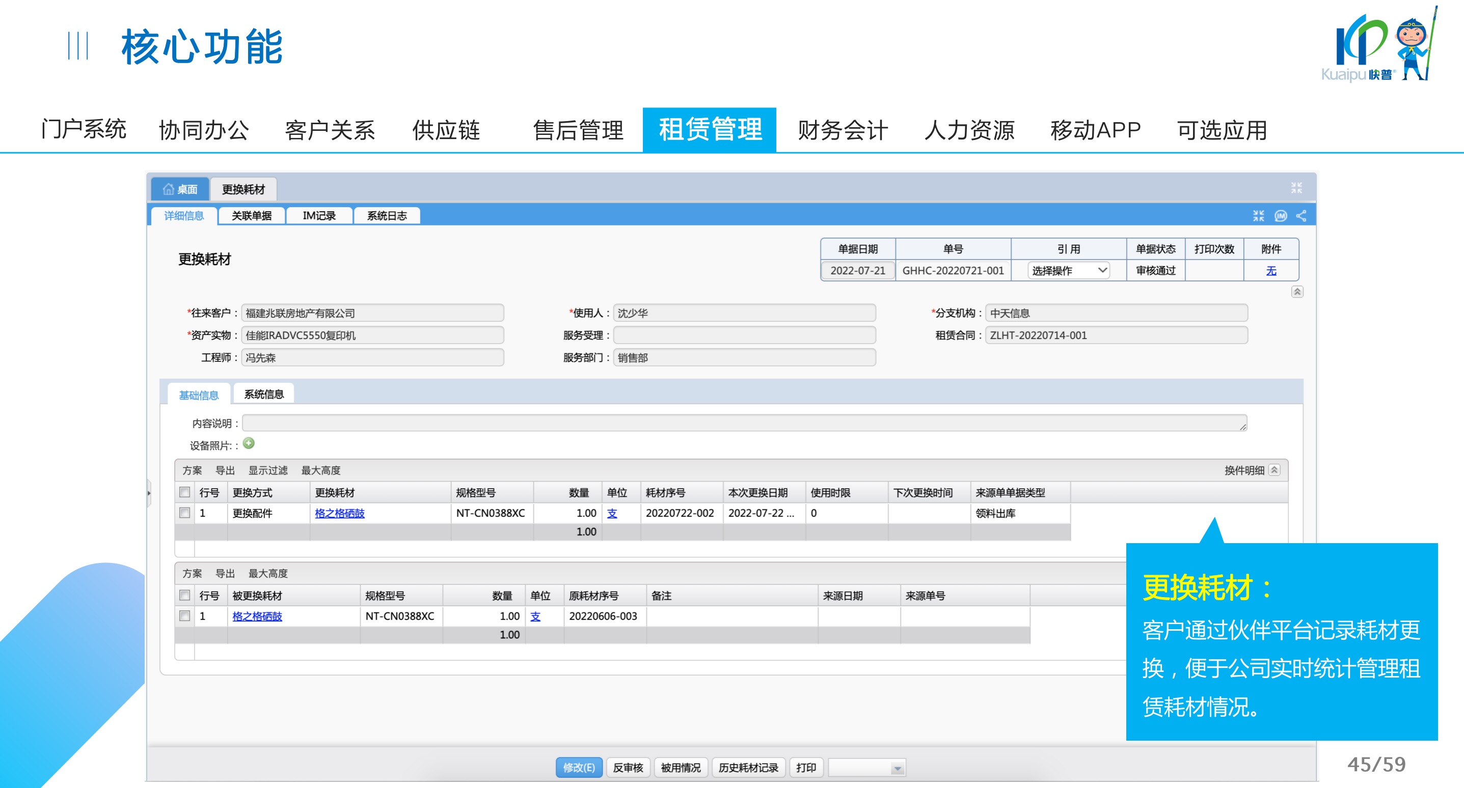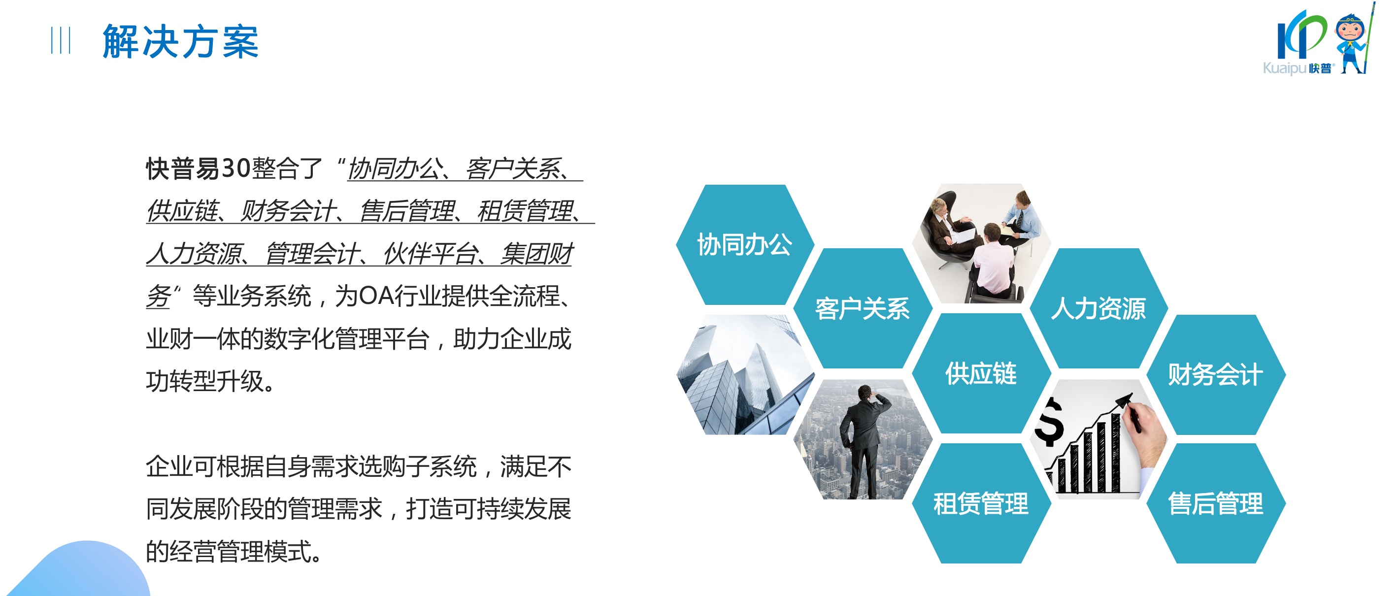 快普易30基于快普近20年在全國上萬家OA企業(yè)的實施與服務(wù)經(jīng)驗,融合了行業(yè)成功的管理智慧,以“客戶+機(jī)器”為中心提供數(shù)字化轉(zhuǎn)型解決方案,全面解決銷售、服務(wù)、租賃等多種業(yè)務(wù)模式的管理需求,以及企業(yè)經(jīng)營核算分析。