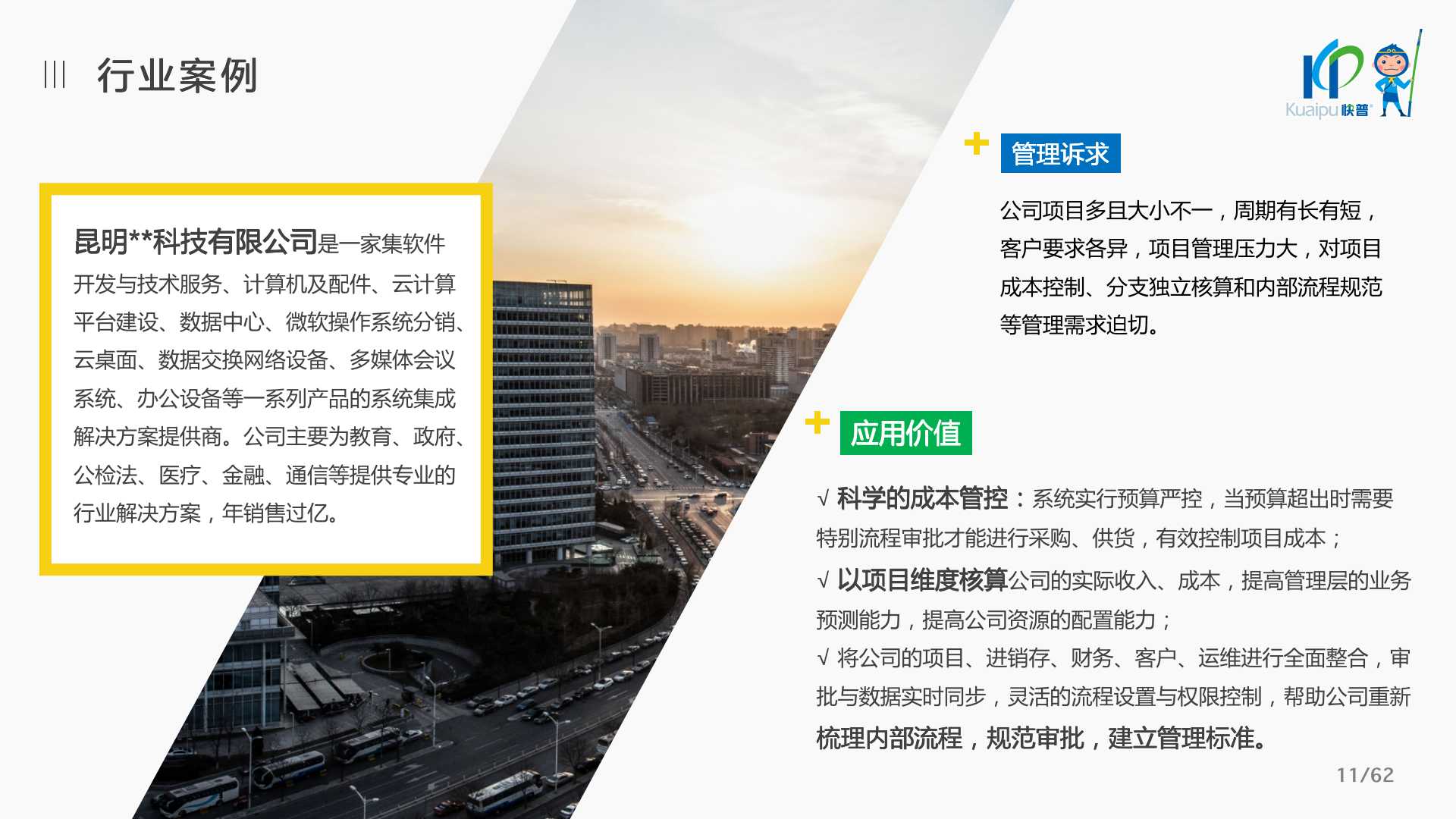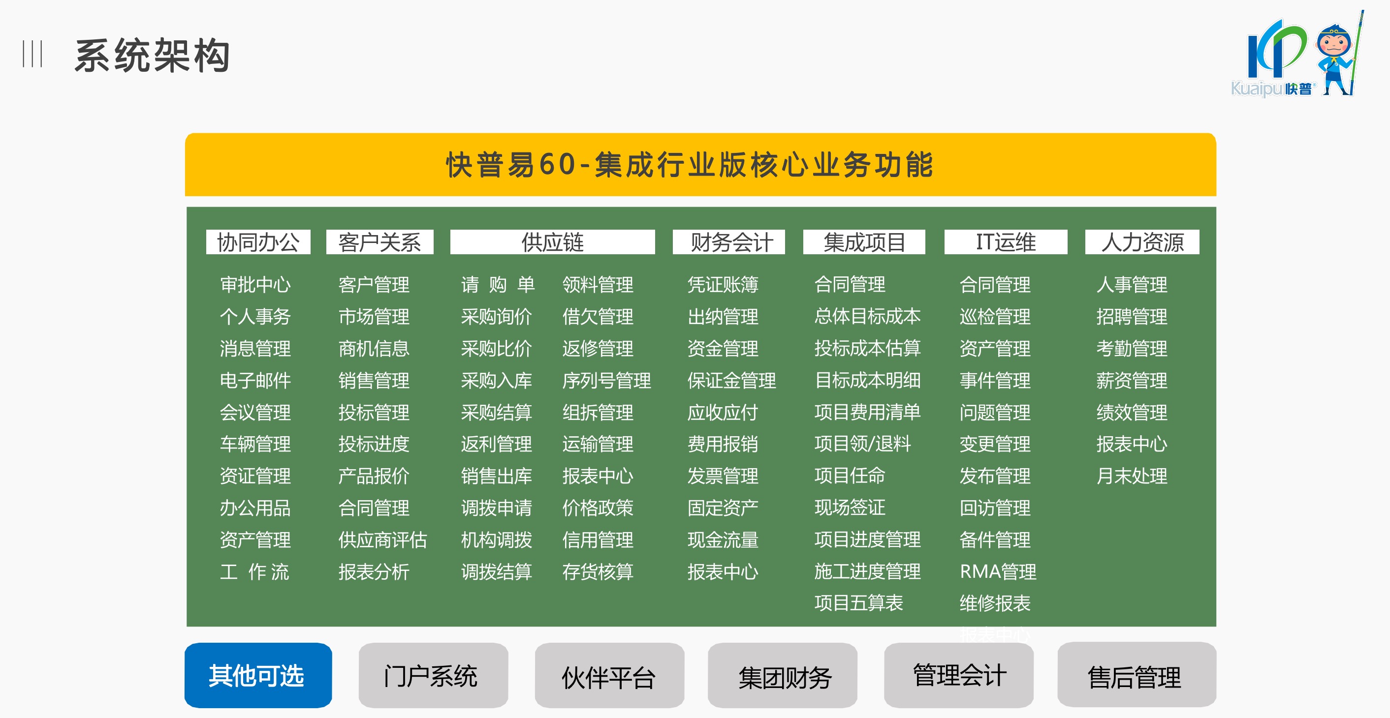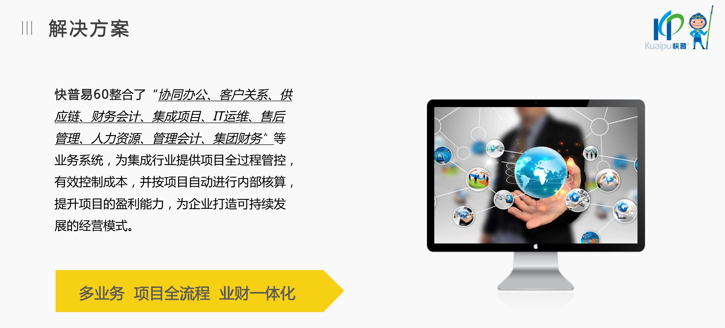 快普易60以客戶為目標(biāo)、以項(xiàng)目為核心,為集成行業(yè)提供數(shù)字化管理解決方案,為組織和業(yè)務(wù)提效,實(shí)現(xiàn)項(xiàng)目全過(guò)程管控,有效控制成本,并按項(xiàng)目自動(dòng)進(jìn)行內(nèi)部核算,提升項(xiàng)目的盈利能力,為企業(yè)打造可持續(xù)發(fā)展的經(jīng)營(yíng)模式。