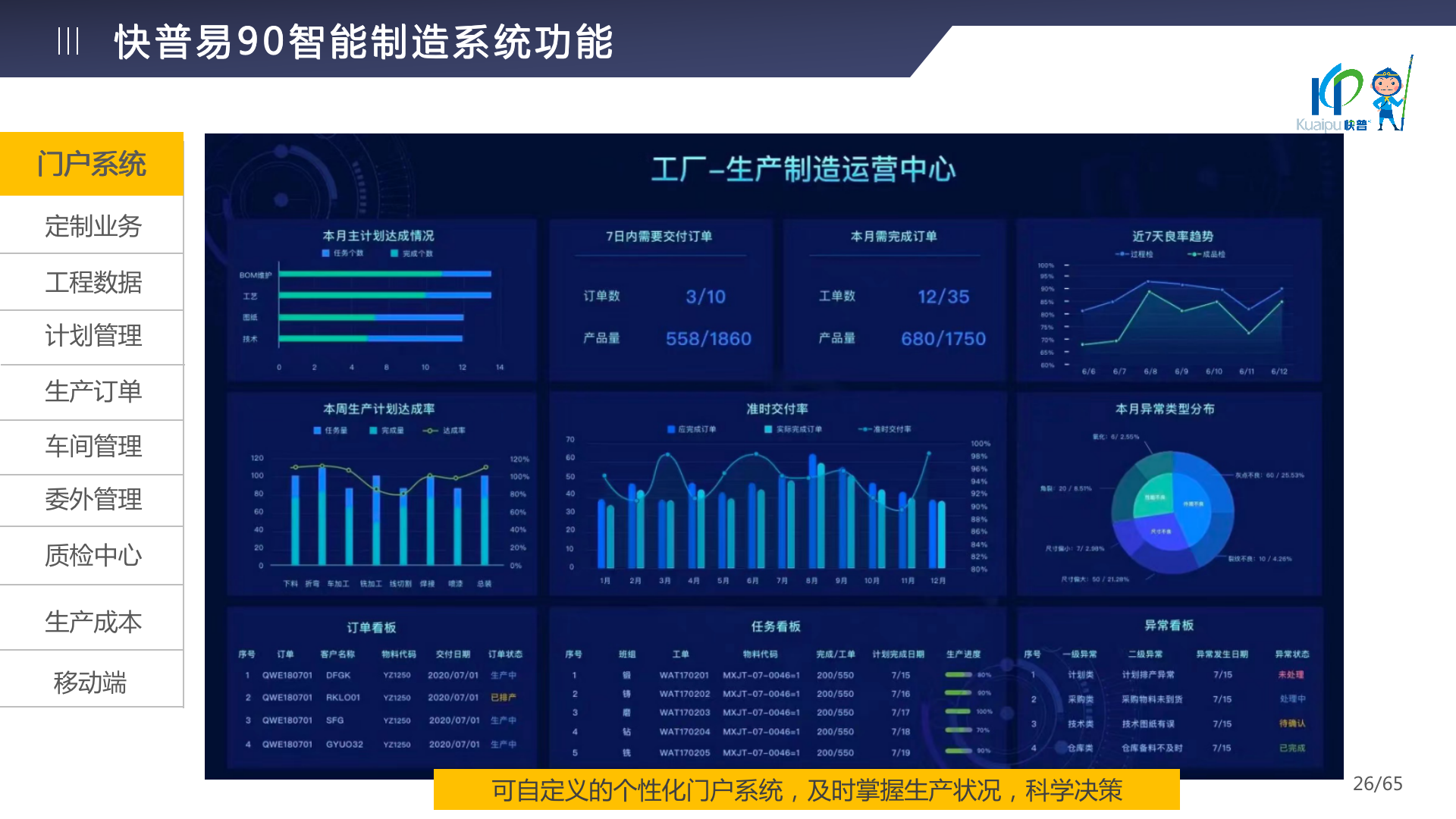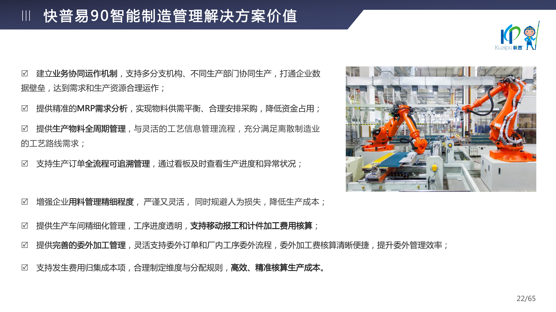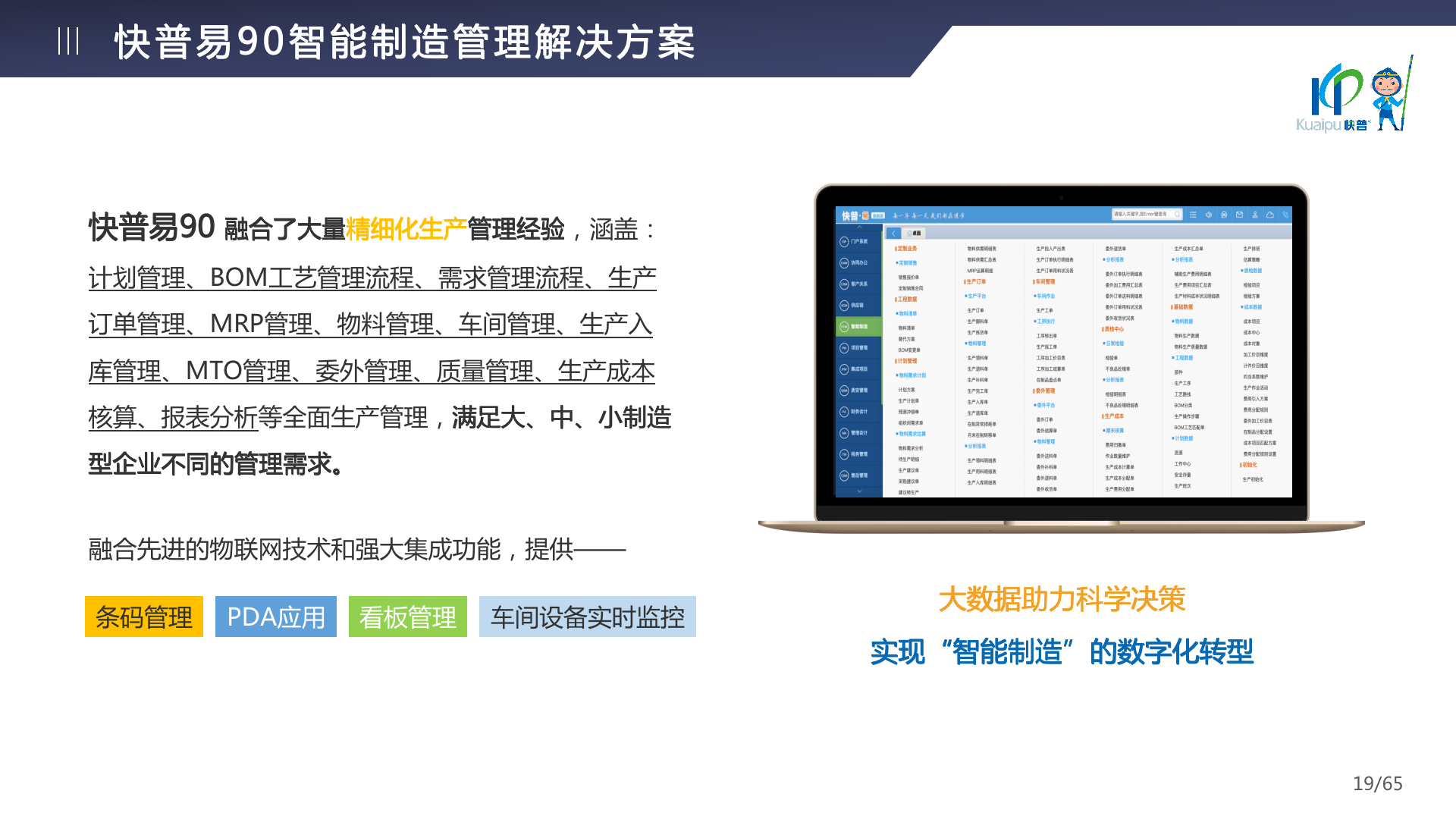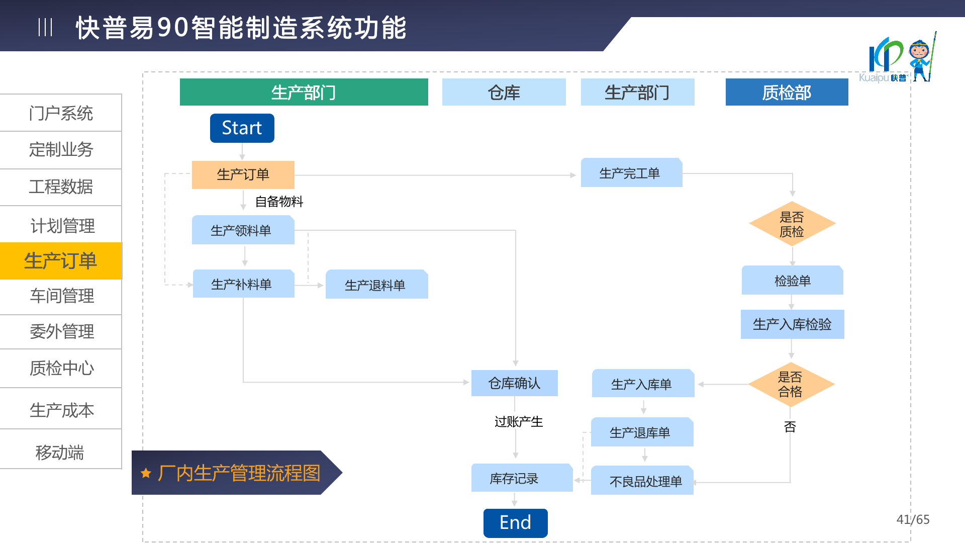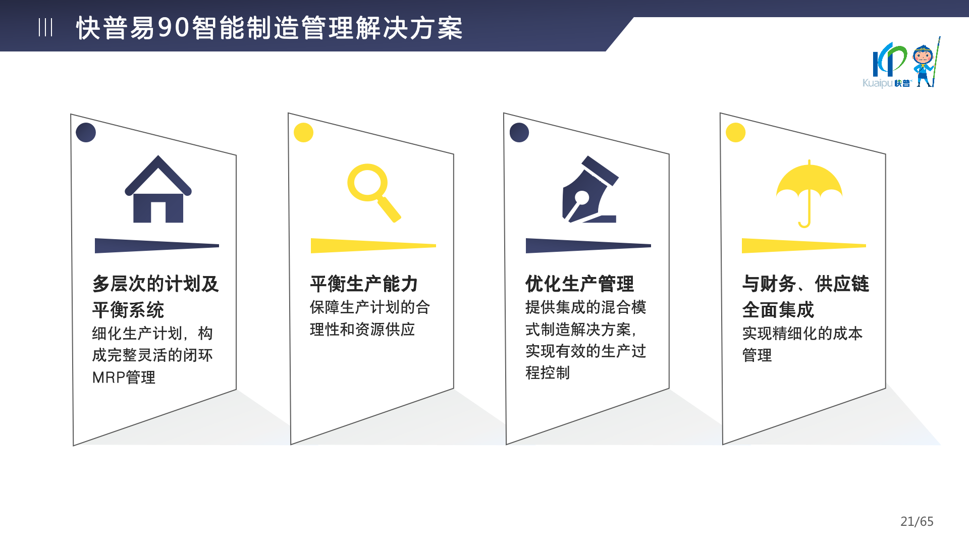 快普易90融合了大量精益生產(chǎn)管理的經(jīng)驗(yàn),涵蓋計(jì)劃管理、BOM管理、MRP運(yùn)算、生產(chǎn)訂單管理、供應(yīng)鏈管理、車(chē)間管理、出入庫(kù)管理、委外管理、質(zhì)量管理、生產(chǎn)成本核算、報(bào)表分析等全面生產(chǎn)管理,為企業(yè)打造實(shí)時(shí)感知變化、分析變化、提供決策的數(shù)字化管理平臺(tái),推動(dòng)企業(yè)創(chuàng)新的管理,實(shí)現(xiàn)“智能制造”的數(shù)字化轉(zhuǎn)型。