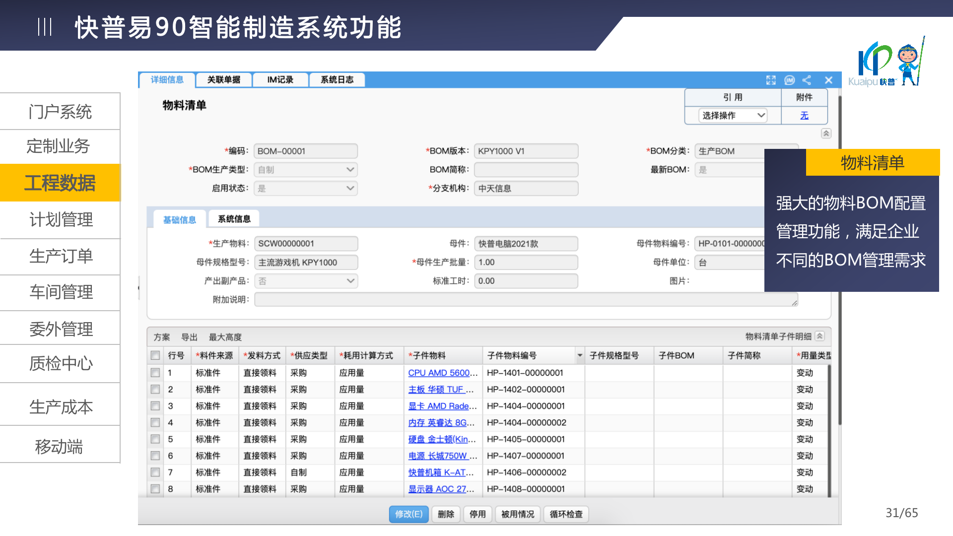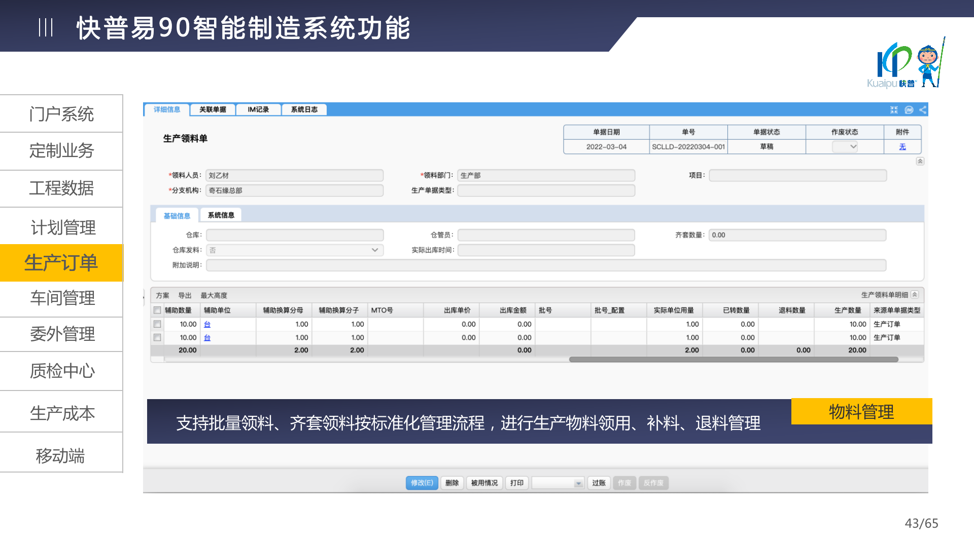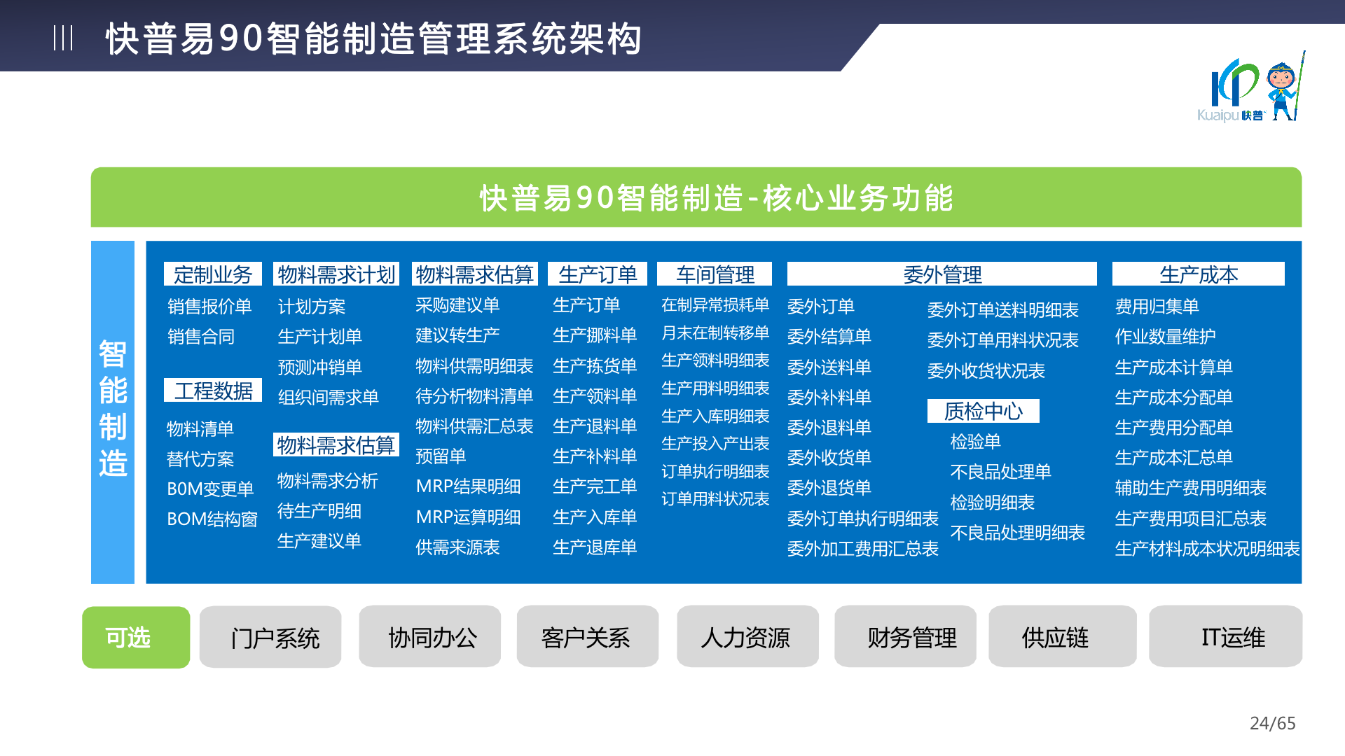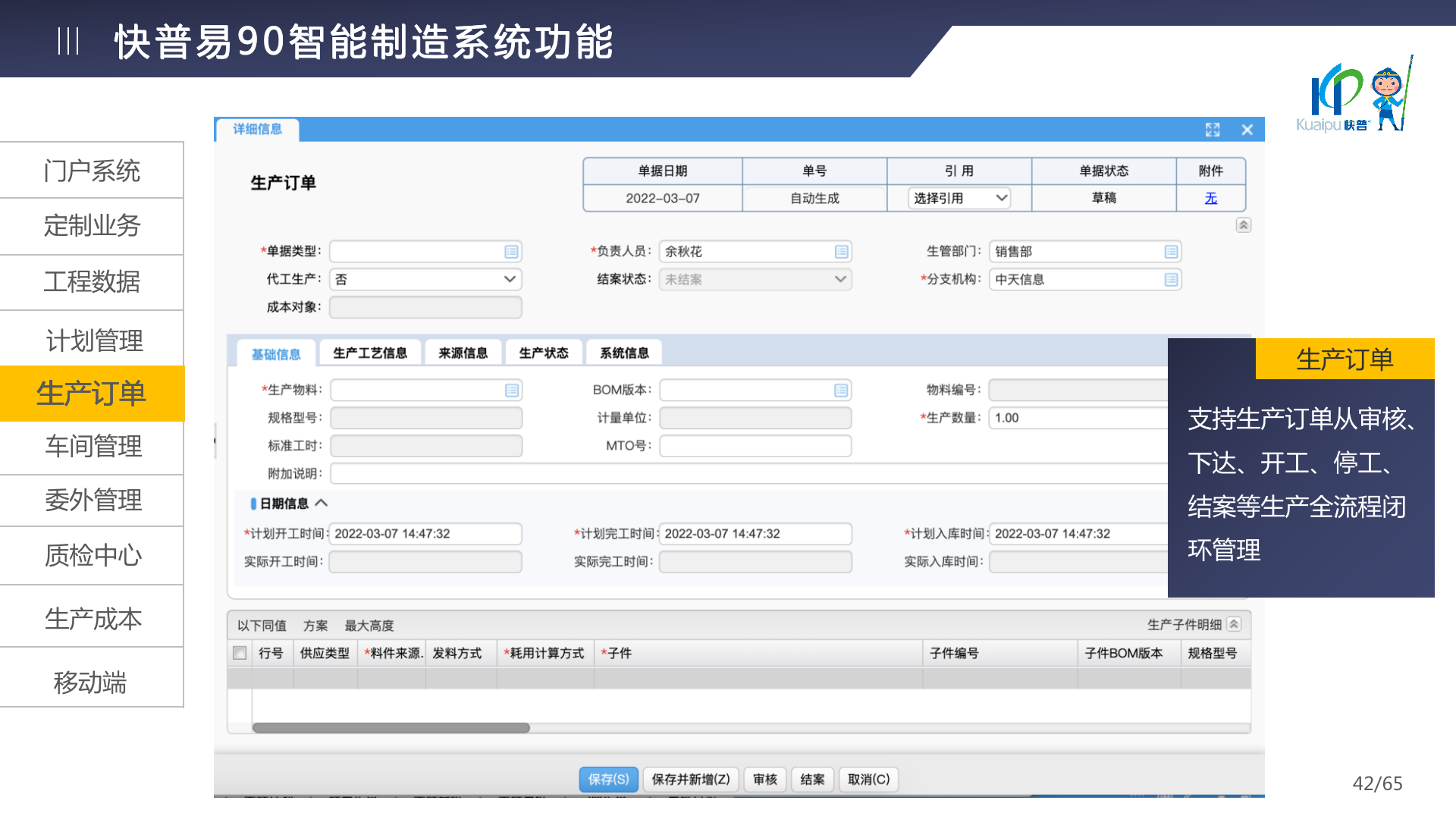 快普易90融合了大量精益生產(chǎn)管理的經(jīng)驗(yàn),涵蓋計(jì)劃管理、BOM管理、MRP運(yùn)算、生產(chǎn)訂單管理、供應(yīng)鏈管理、車(chē)間管理、出入庫(kù)管理、委外管理、質(zhì)量管理、生產(chǎn)成本核算、報(bào)表分析等全面生產(chǎn)管理,為企業(yè)打造實(shí)時(shí)感知變化、分析變化、提供決策的數(shù)字化管理平臺(tái),推動(dòng)企業(yè)創(chuàng)新的管理,實(shí)現(xiàn)“智能制造”的數(shù)字化轉(zhuǎn)型。