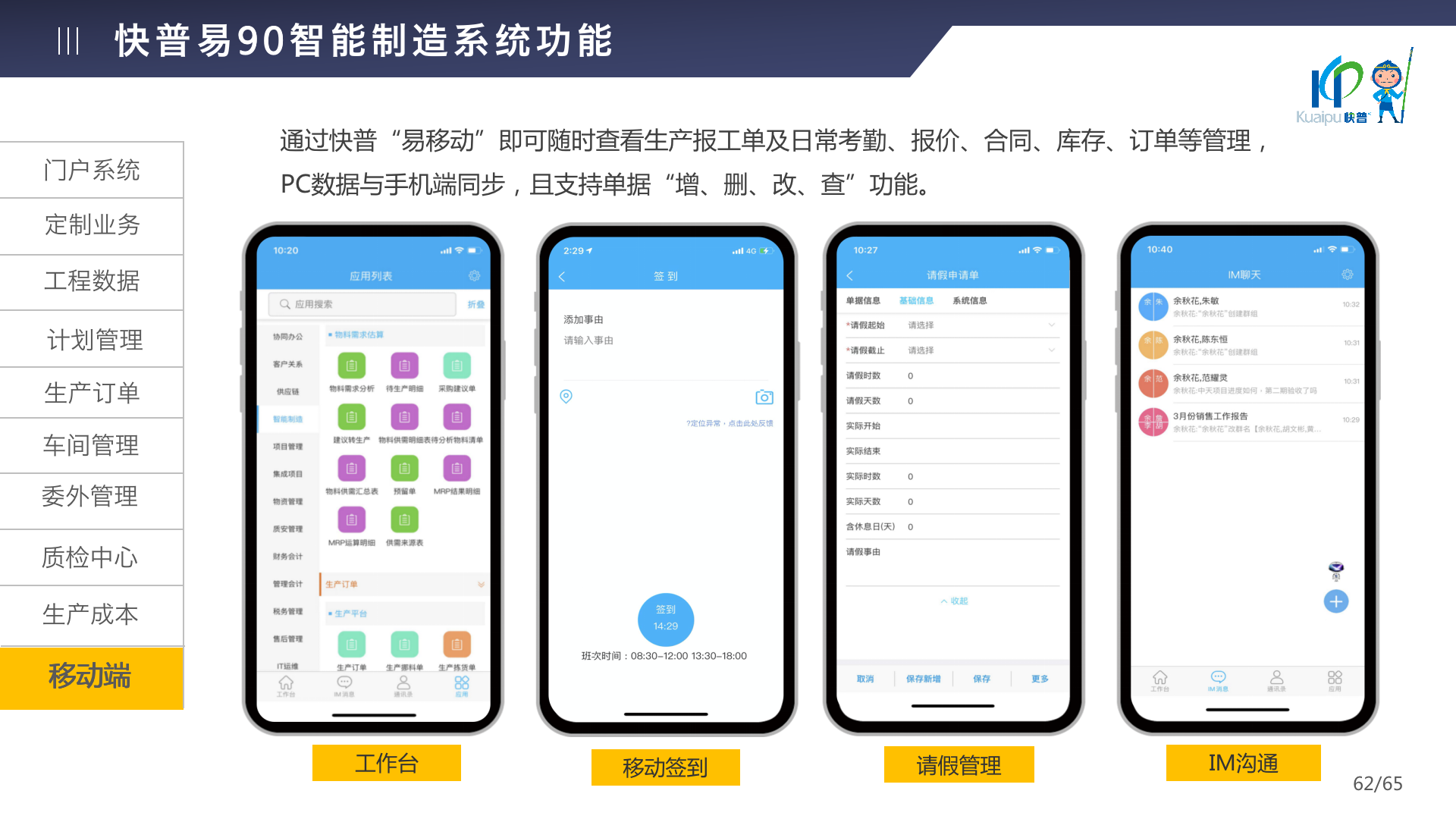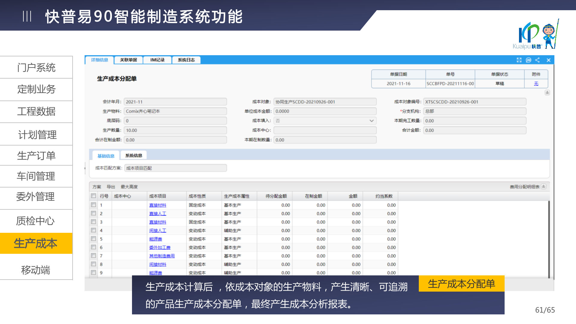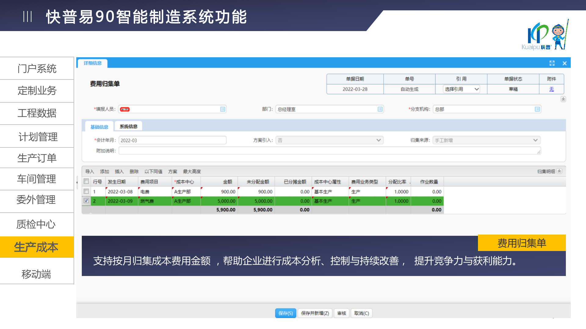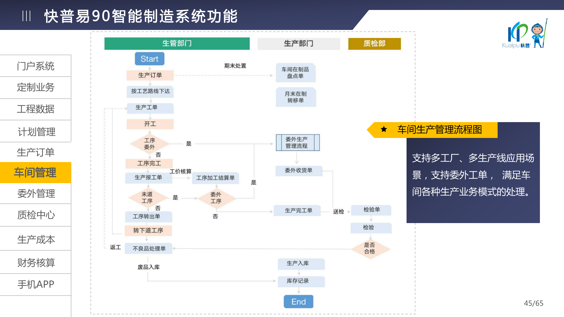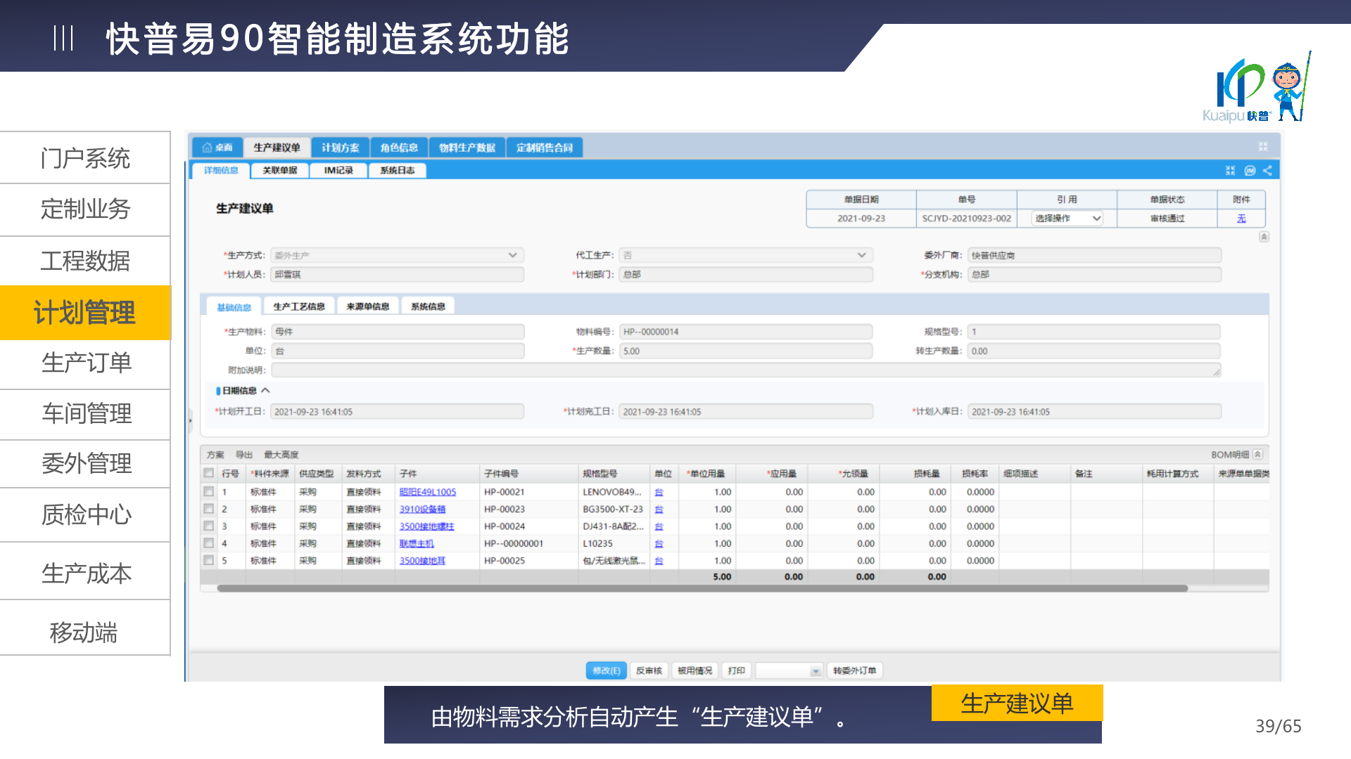快普易90融合了大量精益生產(chǎn)管理的經(jīng)驗(yàn),涵蓋計(jì)劃管理、BOM管理、MRP運(yùn)算、生產(chǎn)訂單管理、供應(yīng)鏈管理、車(chē)間管理、出入庫(kù)管理、委外管理、質(zhì)量管理、生產(chǎn)成本核算、報(bào)表分析等全面生產(chǎn)管理,為企業(yè)打造實(shí)時(shí)感知變化、分析變化、提供決策的數(shù)字化管理平臺(tái),推動(dòng)企業(yè)創(chuàng)新的管理,實(shí)現(xiàn)“智能制造”的數(shù)字化轉(zhuǎn)型。