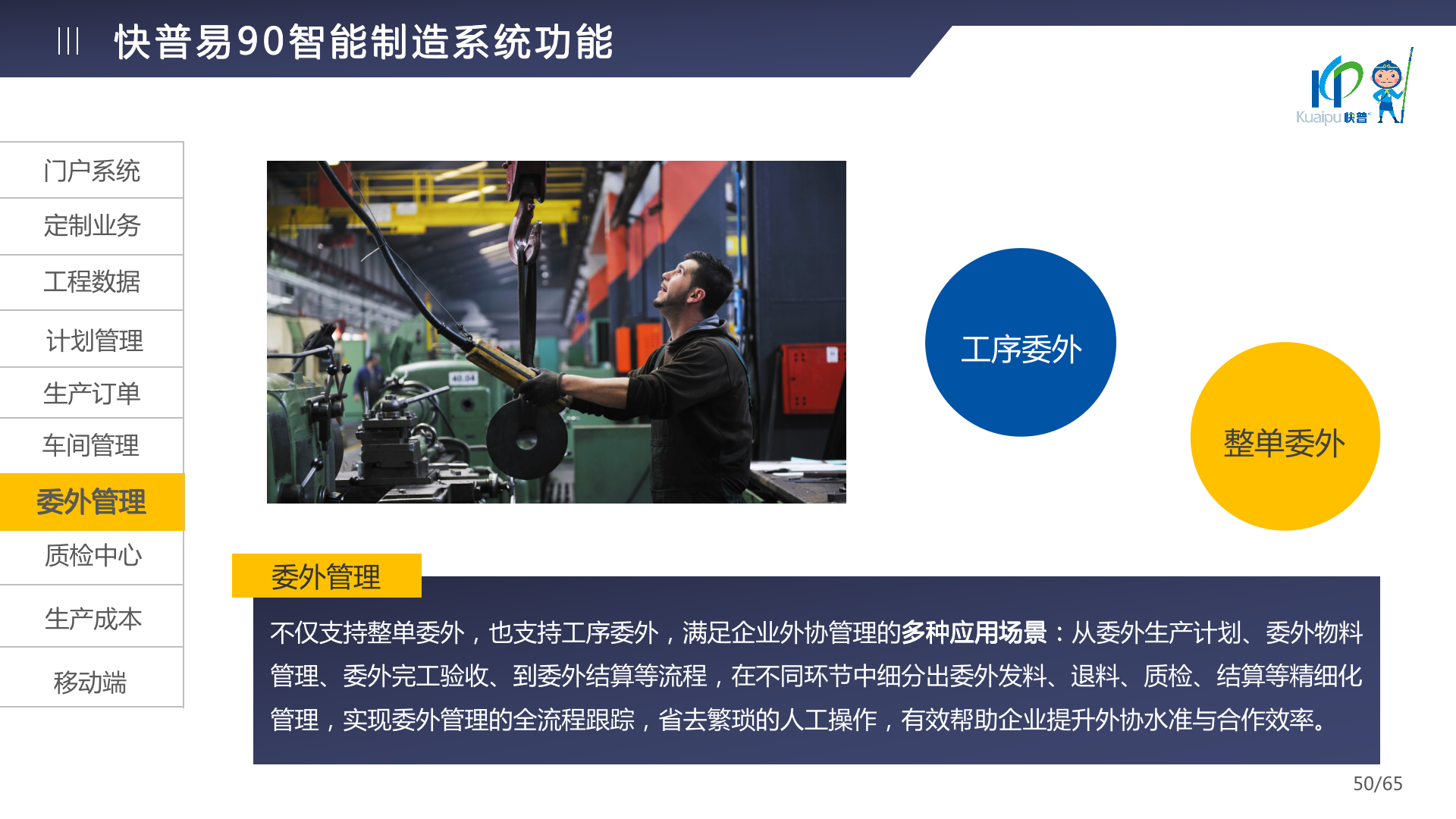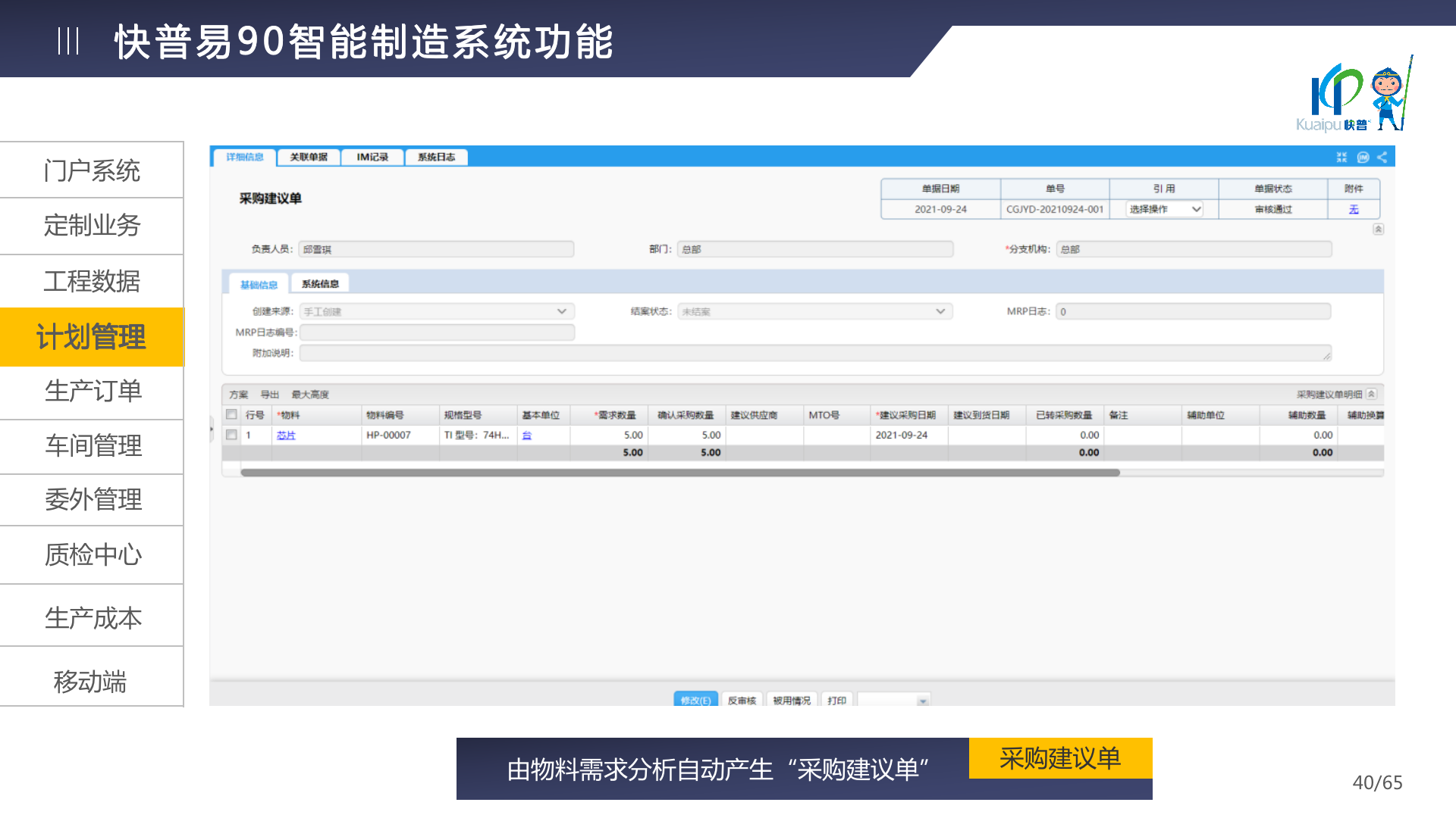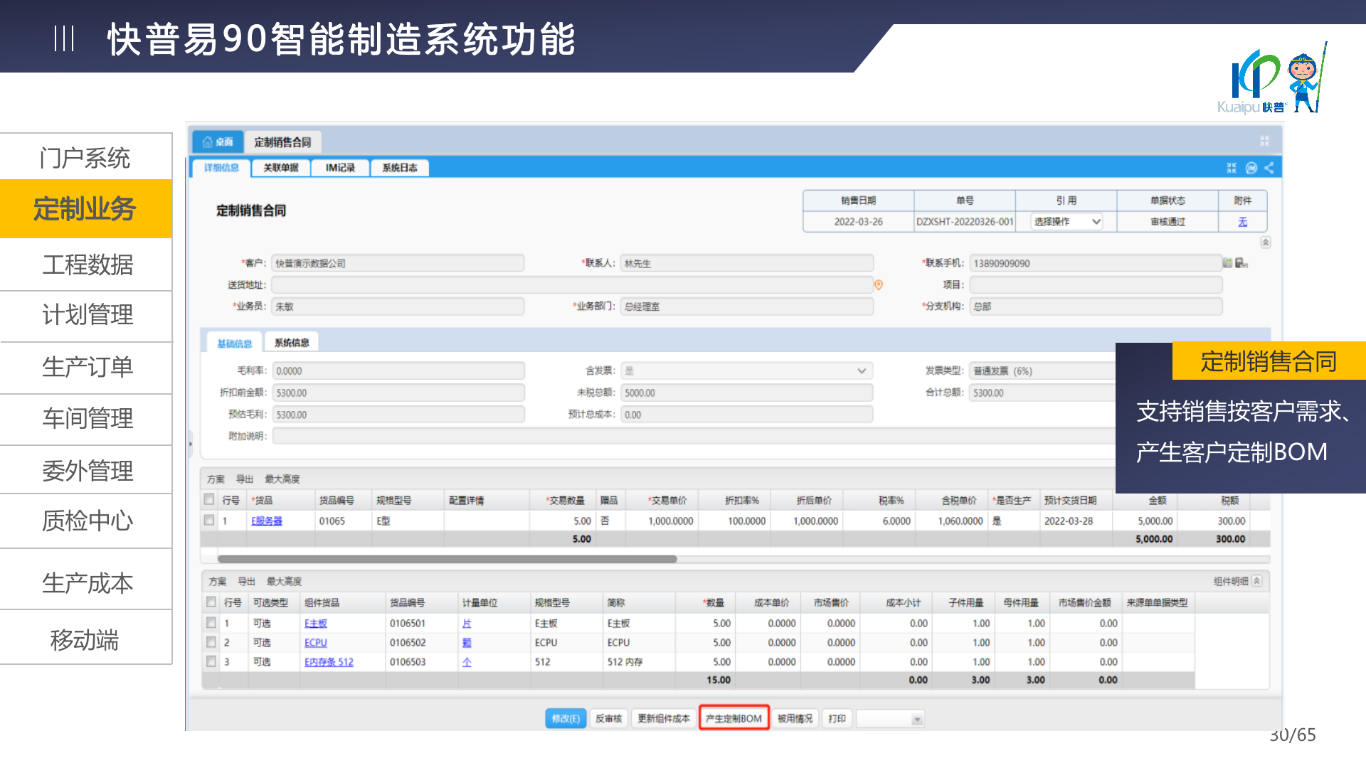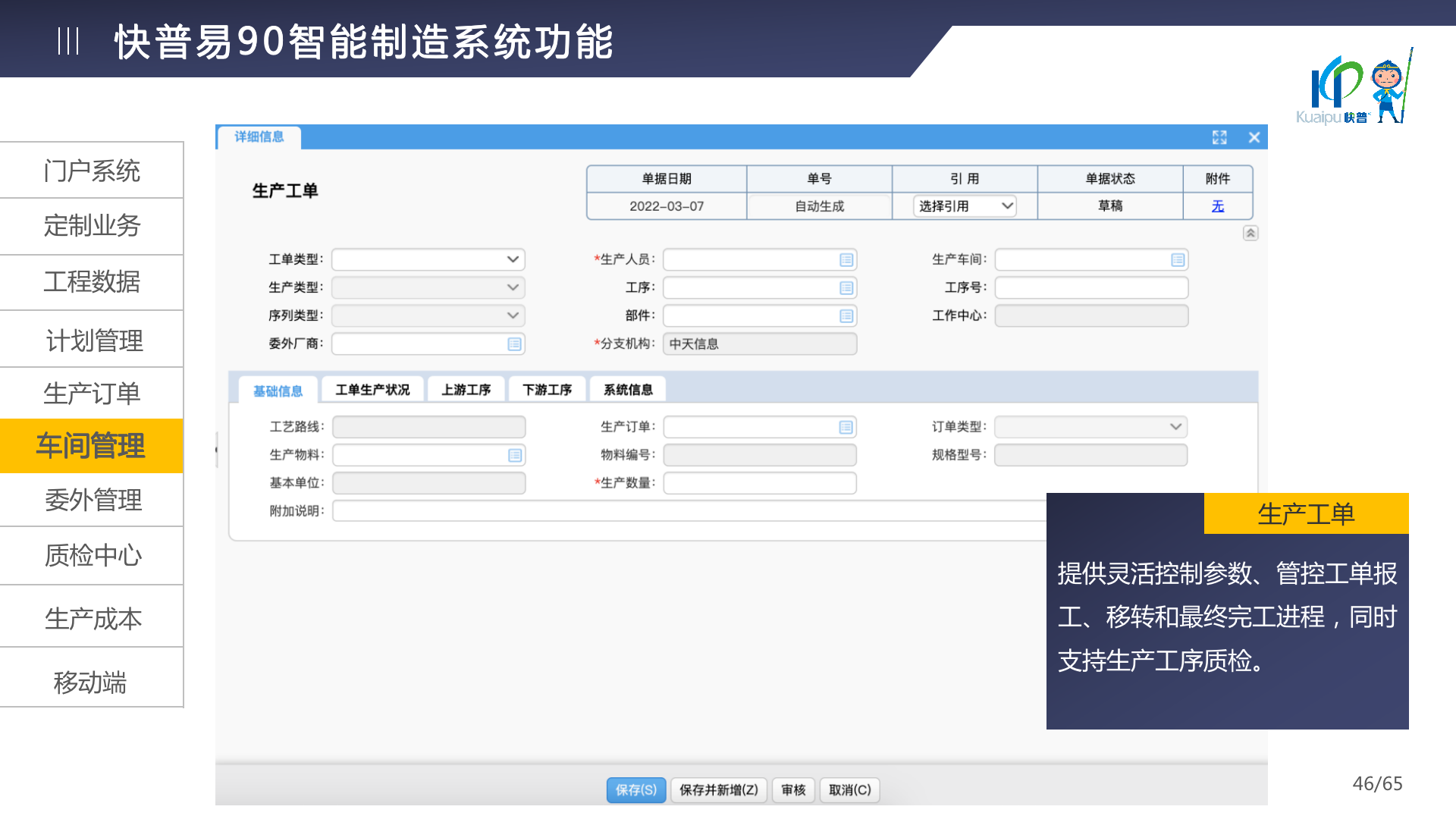 快普易90融合了大量精益生產(chǎn)管理的經(jīng)驗(yàn),涵蓋計(jì)劃管理、BOM管理、MRP運(yùn)算、生產(chǎn)訂單管理、供應(yīng)鏈管理、車(chē)間管理、出入庫(kù)管理、委外管理、質(zhì)量管理、生產(chǎn)成本核算、報(bào)表分析等全面生產(chǎn)管理,為企業(yè)打造實(shí)時(shí)感知變化、分析變化、提供決策的數(shù)字化管理平臺(tái),推動(dòng)企業(yè)創(chuàng)新的管理,實(shí)現(xiàn)“智能制造”的數(shù)字化轉(zhuǎn)型。