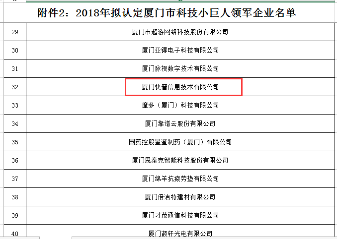 近日,快普獲“廈門市科技小巨人領(lǐng)軍企業(yè)”榮譽(yù)稱號(hào),這是繼2017年獲得廈門市科技小巨人企業(yè)后,再次榮膺領(lǐng)軍企業(yè)行列。