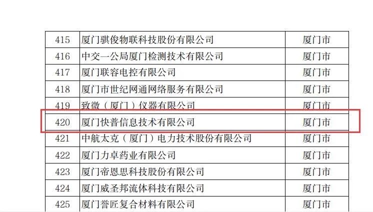 近日,福建省科學(xué)技術(shù)廳網(wǎng)站公示了“2022年福建省科技小巨人企業(yè)”名單,廈門快普信息技術(shù)有限公司以突出的自主創(chuàng)新能力、優(yōu)秀的技術(shù)研發(fā)成果、良好的業(yè)績(jī)和市場(chǎng)占有率,從全省遴選企業(yè)中脫穎而出,成功入選!