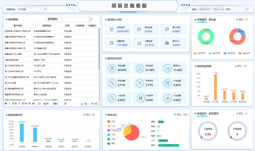 1、智慧決策體系:構(gòu)建涵蓋項目毛利率、質(zhì)保金狀態(tài)等項目關(guān)鍵指標(biāo)的多維度數(shù)據(jù)看板,支持管理層與執(zhí)行層分級透視。