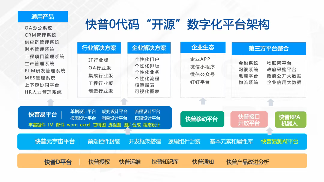 為此,快普依托自主研發(fā)的“快普易”整合管理平臺(tái),以先進(jìn)的技術(shù)架構(gòu)為企業(yè)提供簡單、靈活的應(yīng)用體驗(yàn)。平臺(tái)具備零代碼配置、多系統(tǒng)無縫整合、AI深度嵌入等核心優(yōu)勢(shì),為企業(yè)提供一條“小快輕準(zhǔn)”的數(shù)字化轉(zhuǎn)型路徑: